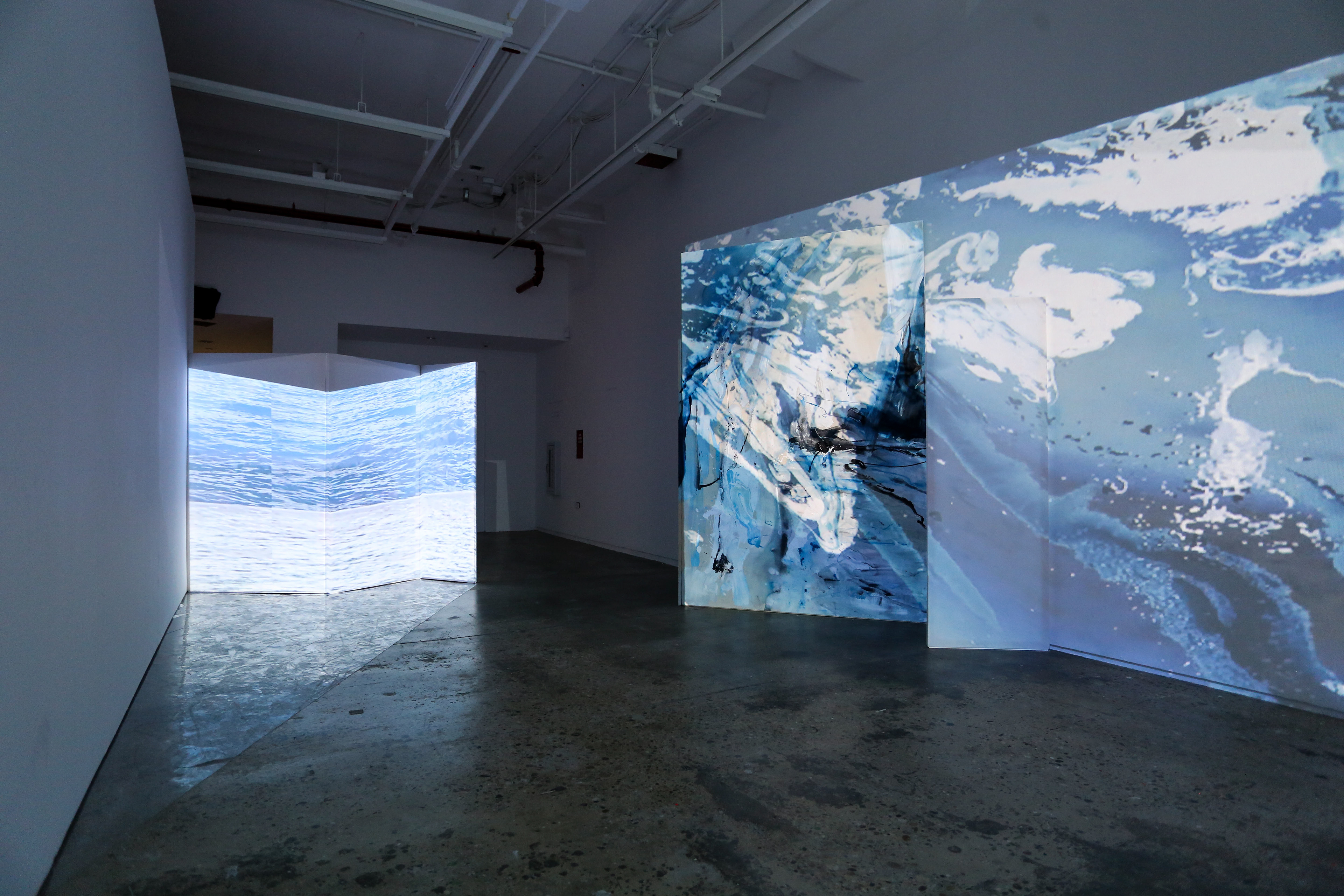 Mapped videos projected on paintings and screens, vinylÂ