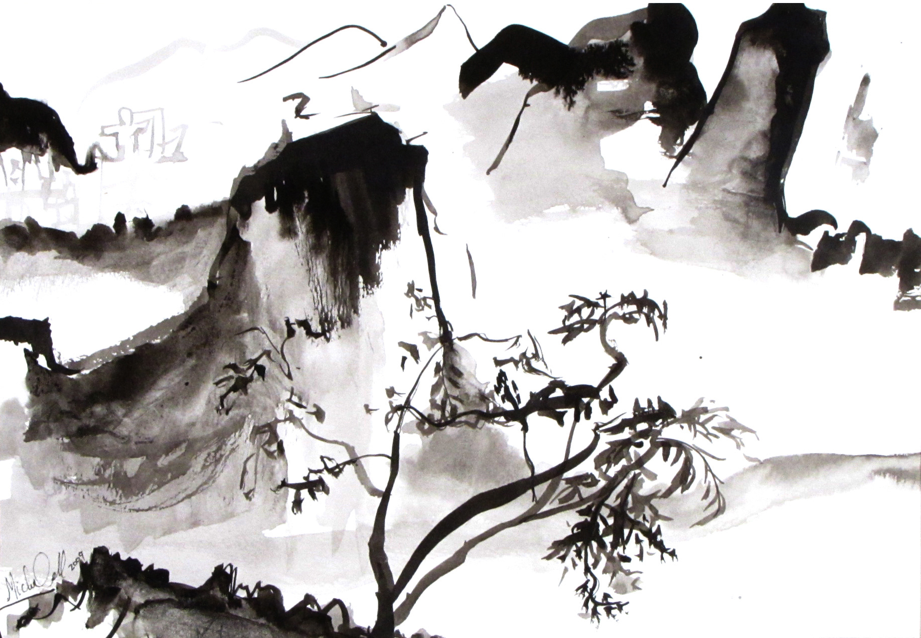 Mountains and Tree, 8"x11.5", ink on paper, 2008