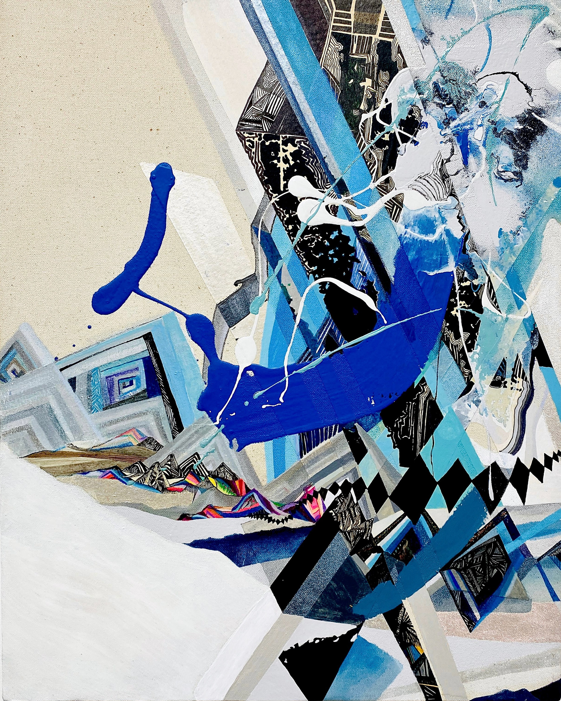 Through, 16"x20", acrylic, screen print collage, colored pencil, marker, and pen on canvas, 2021